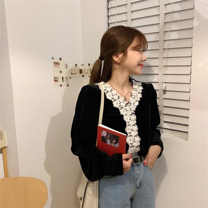 【送料無料】レースベロアトップス Vネック tops No.1015