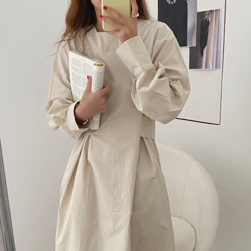 【商品説明】ラウンドネックのロングワンピースです!ウエスト部分が引き締めデザインになっていてかわいいです!